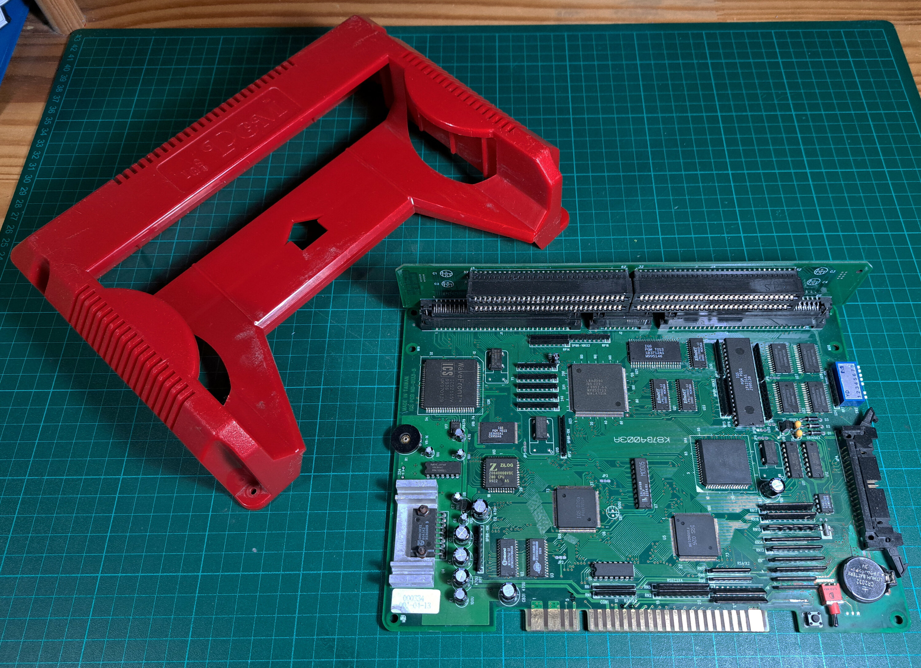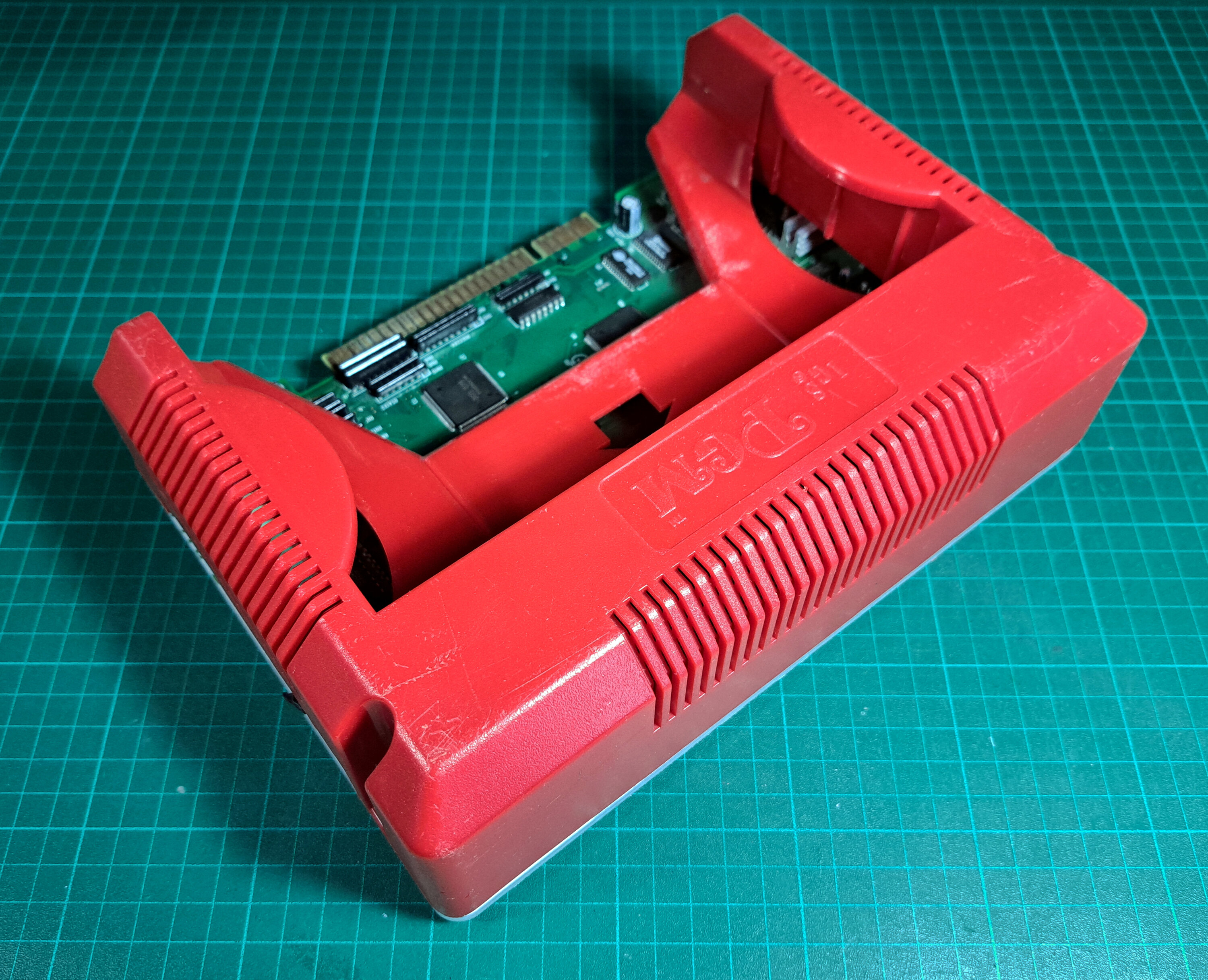 Pour cacher la grand entaille faite dans le boîtier, j'avais collé du carton de chemise colorée. (notez l'isolant en chiffon quadrillé, utilisé là car les seules vis que j'ai trouvé étaient trop grosses et auraient fait court-circuit en touchant les pistes de ma plaquette).